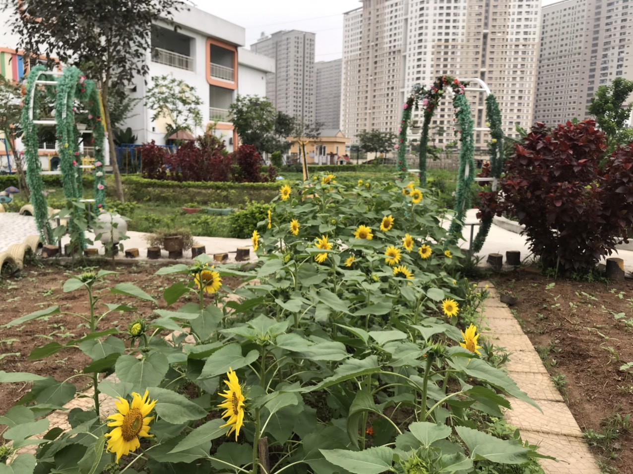 Vườn hoa hướng dương rực rỡ chờ đón các bé đến trường.