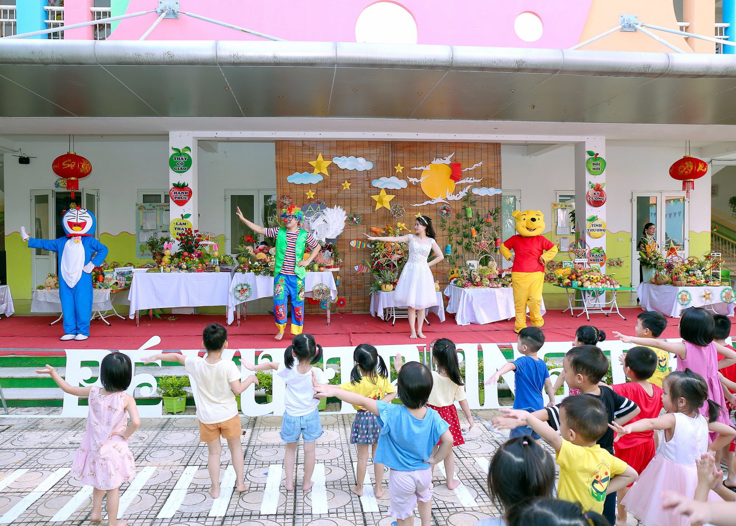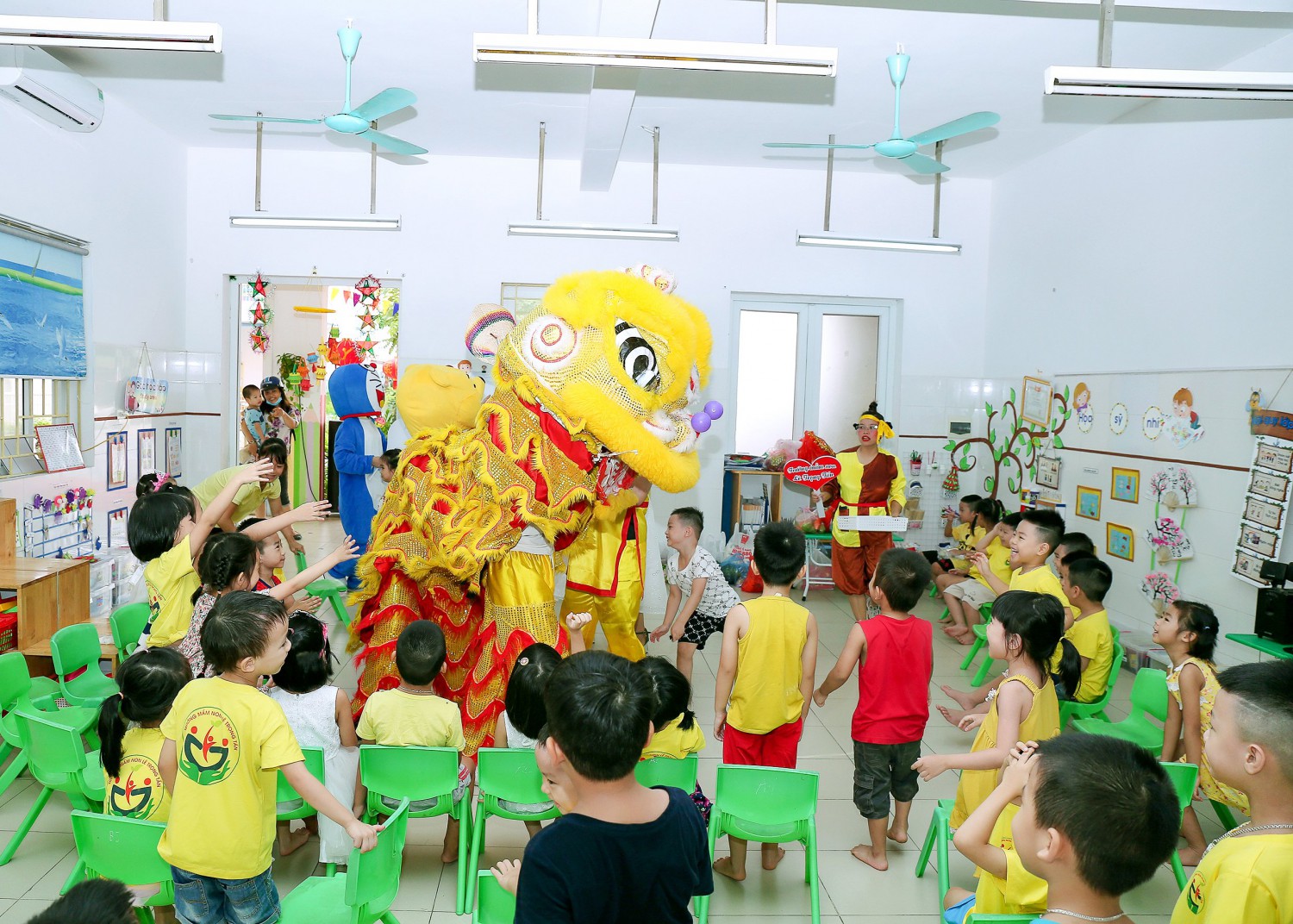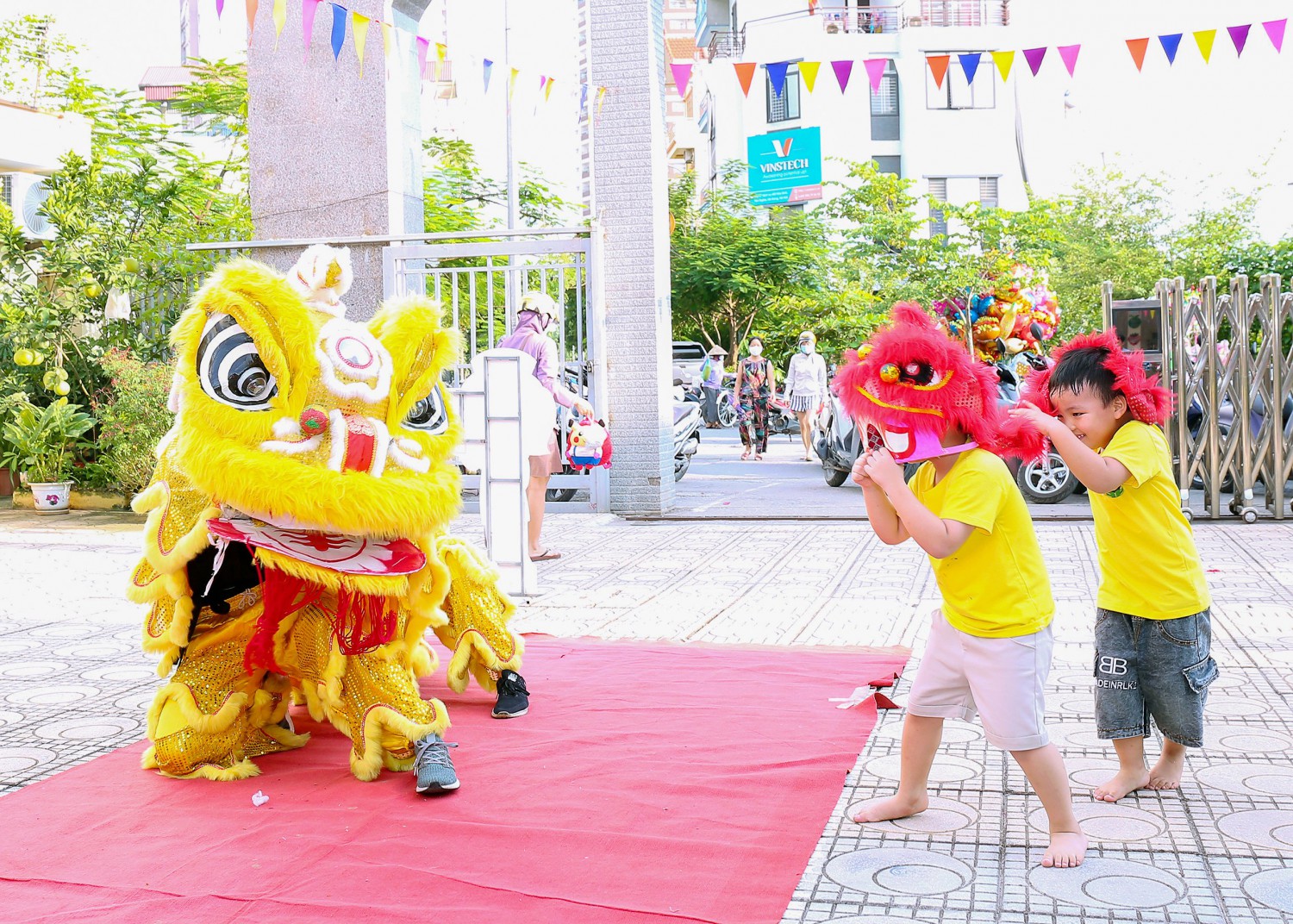 Ngay từ sáng sớm đoàn múa lân sư tử, những nhân vật hoạt hình gần gũi, hằng nga, chú cuội đã có mặt để chào đón và vui cùng các bé ở cổng trường khiến không khí vô cùng sôi động và náo nhiệt. Những ánh mặt ngạc nhiên của các bé dõi theo màn múa lân sư tử, những nụ cười hồn nhiên, thích thú khi được chị Hằng, chú Cuội và các nhân vật hoạt hình xoa đầu, chụp ảnh cùng.