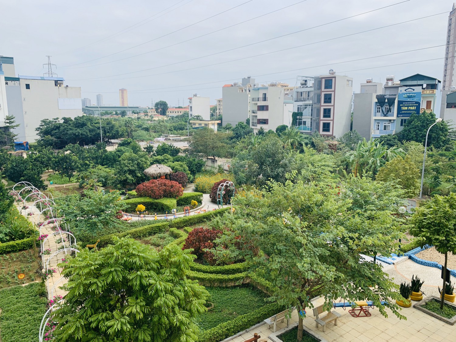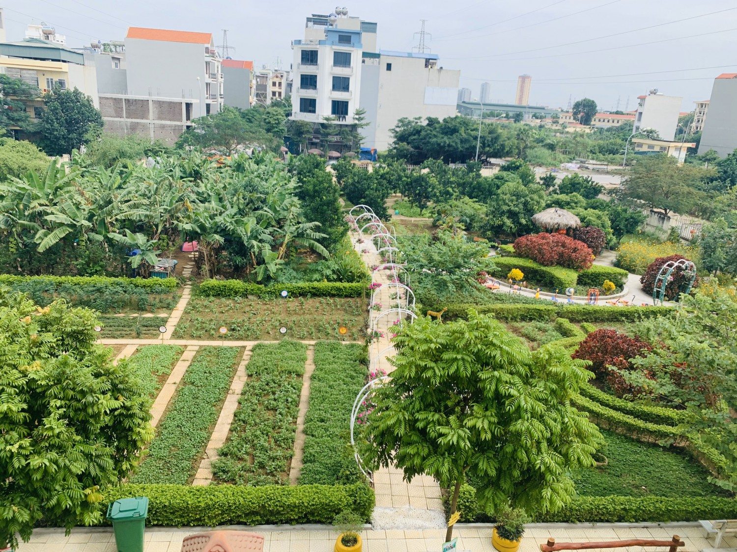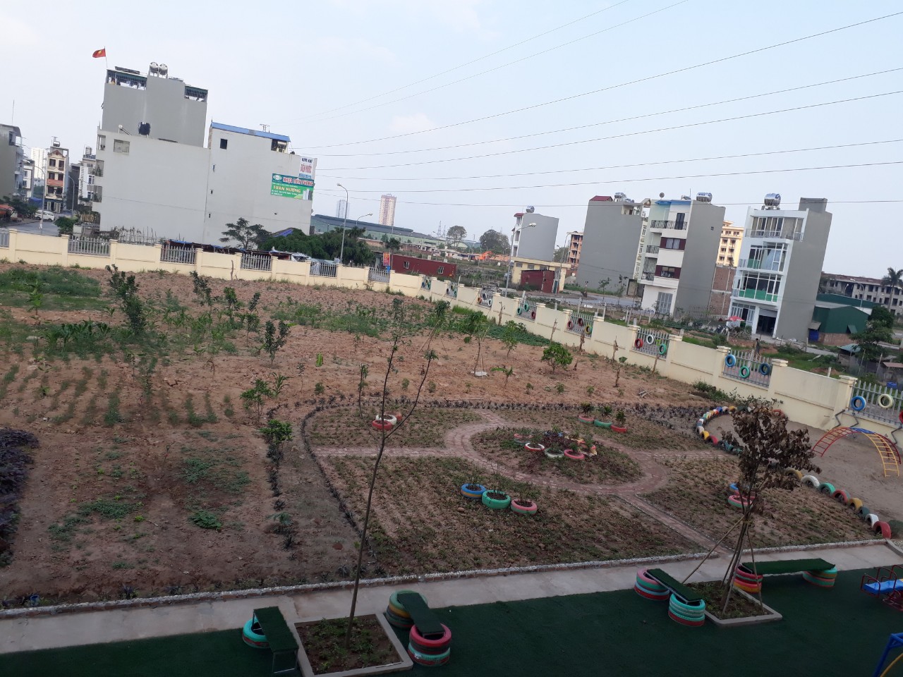 Khu vực cát sỏi sau khi đã được cải tạo Đến với khu vườn 3.600 m2, trước đây là những hố sâu nước ngập 2m, cỏ mọc hoang.. với điều kiện khó khăn, ngày đầu đổ đất cải tạo đất, nhà trường xin đất công trình đổ dưới sâu 2 m và đất màu phủ trên, xếp gạch làm lối đi mục tiêu tạo thành khu vườn cho cô và trẻ; với sự chung tay của phụ huynh và người nhà là mẹ giáo viên có kinh nghiệm trồng vườn đến tư vấn giúp đỡ. Nhà trường đã Quy hoạch thành khu vườn rau sạch - vườn rau yêu thương xây dựng cảnh quan môi trường sư phạm gắn với môi trường thiên nhiên xanh- sạch- đẹp và ý nghĩa đông thời giúp trẻ có không gian học tập, tìm hiểu các kiến thức về các loại rau, cây xanh, biết yêu thương, chăm sóc cây cối, bảo vệ môi trường, có các kỹ năng xới đất, gieo hạt, tưới cây, nhổ cỏ; được hòa mình với thiên nhiên xanh sạch đẹp, được học các kỹ năng làm vườn; ươm cây, tưới rau, bắt sâu, nhổ cỏ, thu hoạch rau mang về giao cho cô nhà bếp nấu ăn cho trẻ… Qua những hoạt động trải nghiệm như vậy, trẻ như lớn dần lên mỗi ngày, có thêm nhiều hiểu biết, rèn luyện kỹ năng sống, bồi dưỡng tình yêu thiên nhiên của trẻ....