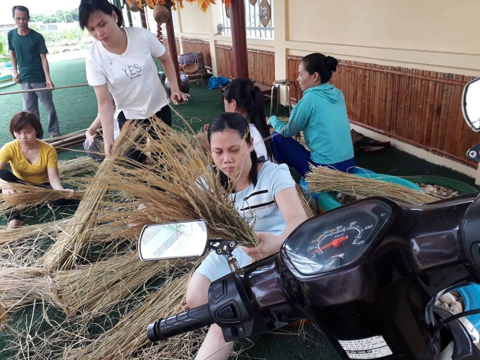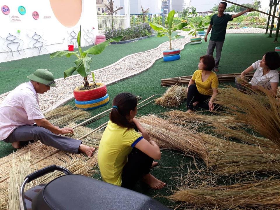 Các cô giáo và bác bảo vệ lợp mái bằng lá cọ và rơm xin được.