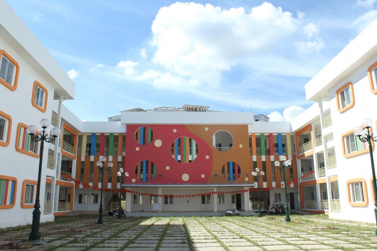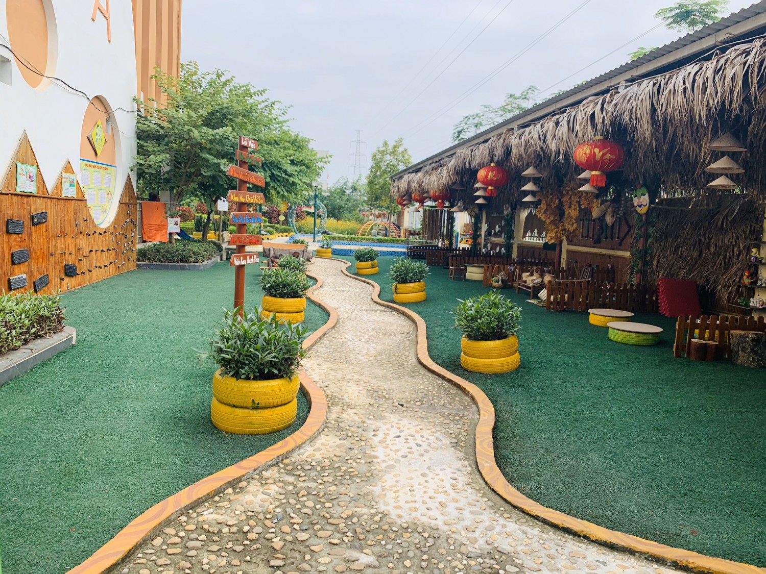 Khuôn viền khu vườn rộng 3600m2 thời điểm hiện tại. Nhà trường đã cải tạo khu nhà để xe của CBGVNV thành khu nhà dân gian cho trẻ hoạt động.Với phần mái xin được lá cọ của Công ty môi trường họ cắt tỉa lá cây cọ ở đường về phơi khô sau đó các cô giáo cùng bác bảo vệ lợp mái, mảng tưởng khu dân gian tận dụng cây trúc nhỏ nhờ chồng cô giáo làm thợ mộc đến ghép phun sơn thành mảng tường trẻ chơi âm nhạc, xâu dây, đặc biệt trẻ chơi nghe âm thanh từ chuông gió bằng trúc...Một số các trò chơi dân gian nhà trường lựa chọn đưa vào không gian này như: Trò chơi Ô ăn quan, bịt mắt bắt dê, kéo mo cau...Trẻ vẽ tranh đông hồ, làm xưởng gốm, bán hàng...
