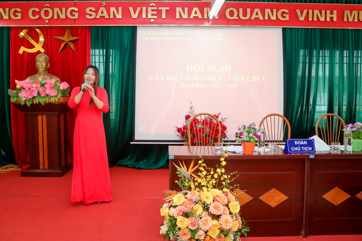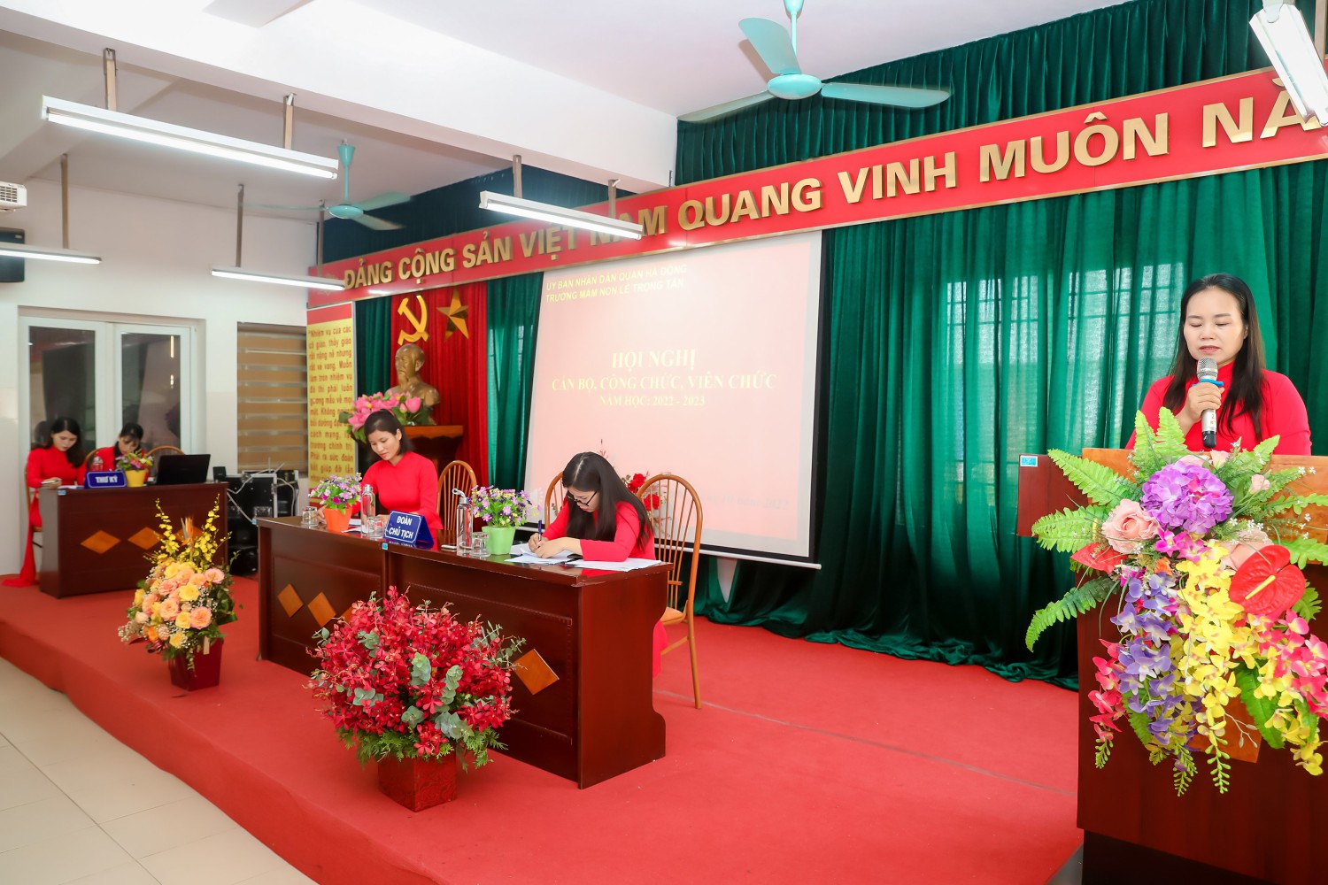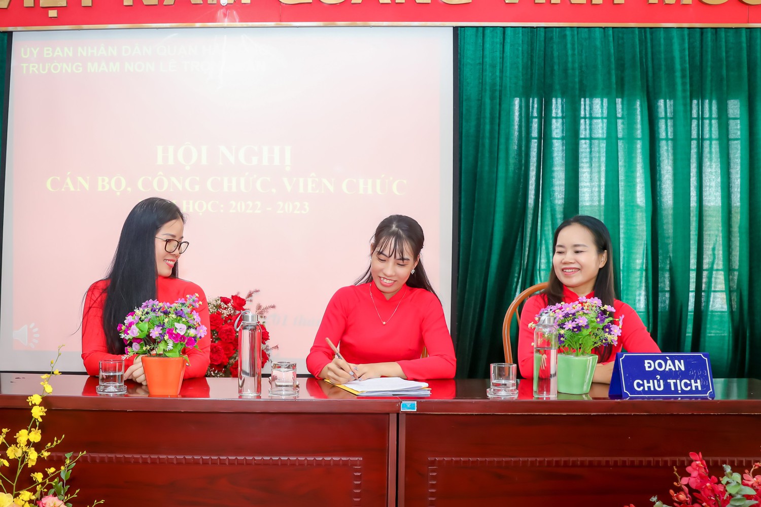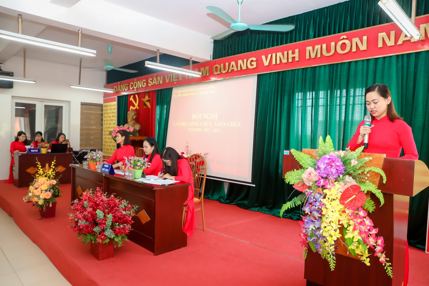 Ban tổ chức giới thiệu thành phần tham dự Hội nghị và nhiệt liệt chào mừng toàn thể các đồng chí CBCC, VC, NLĐ và đoàn viên công đoàn Trường Mầm non Lê Trọng Tấn đã có mặt đông đủ.