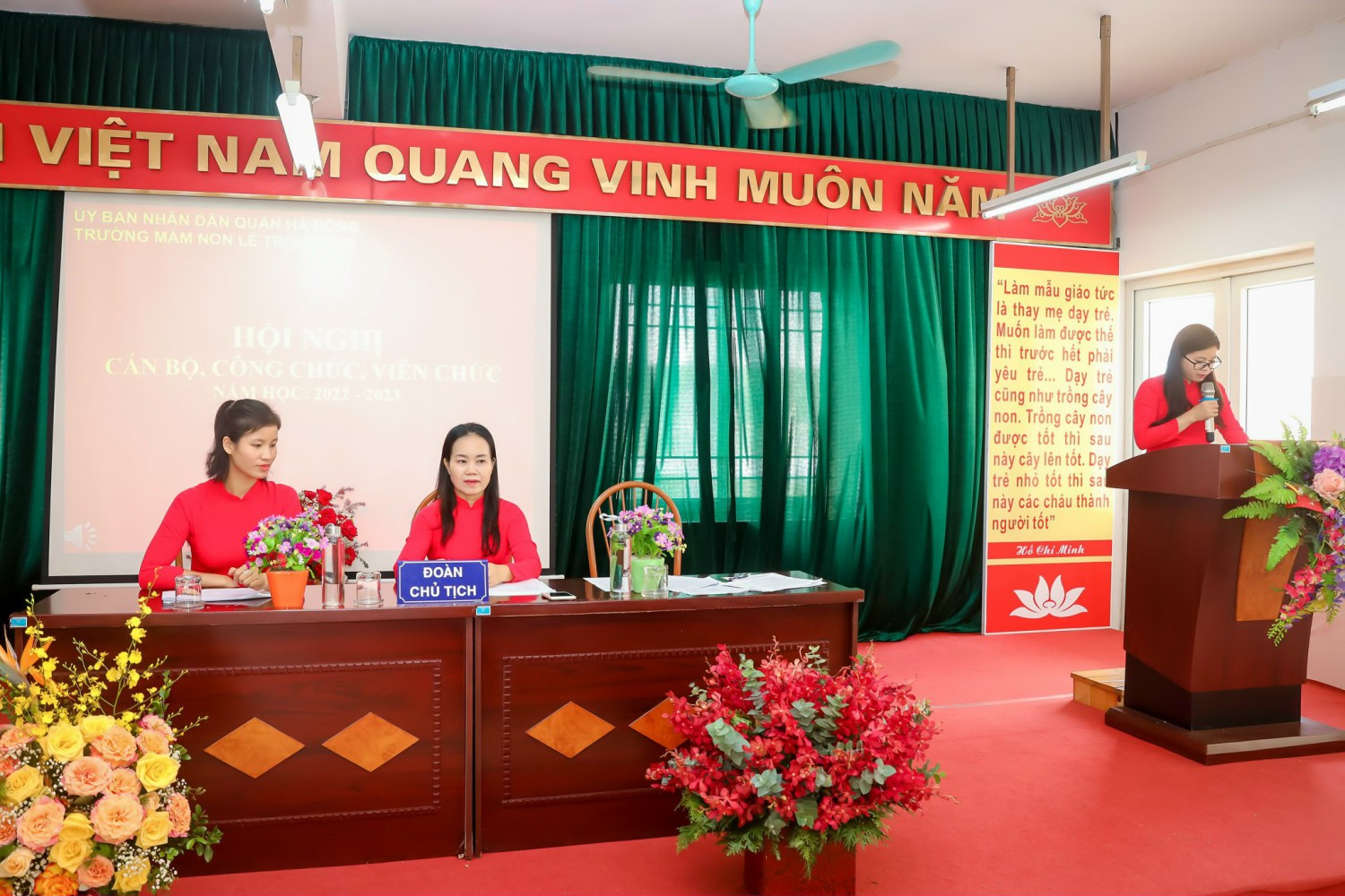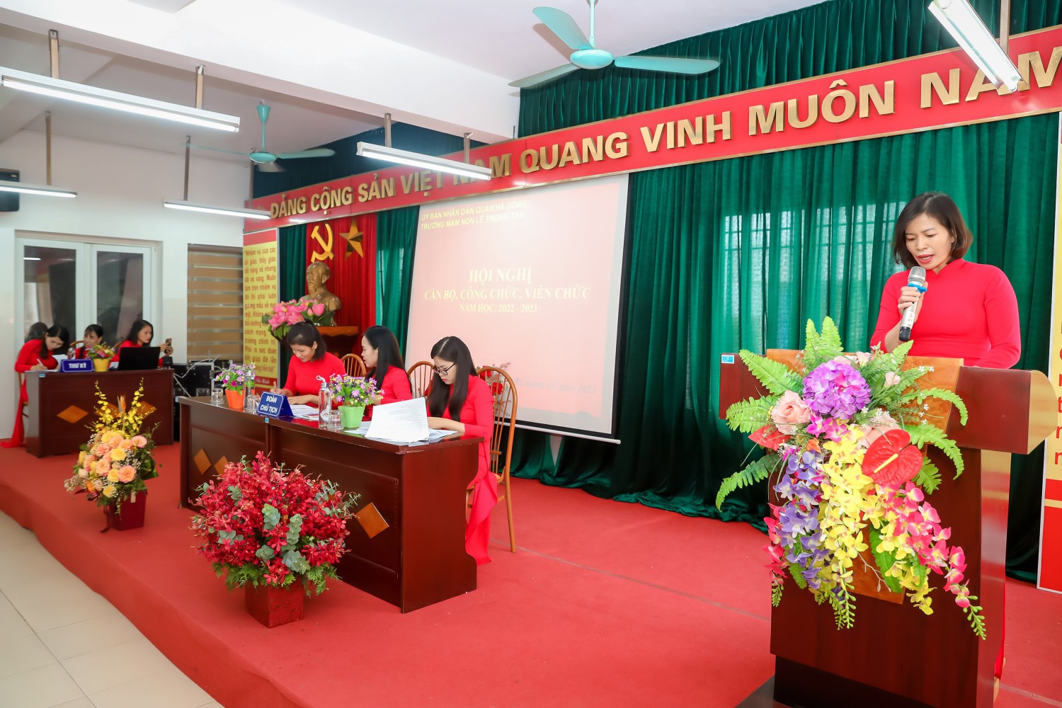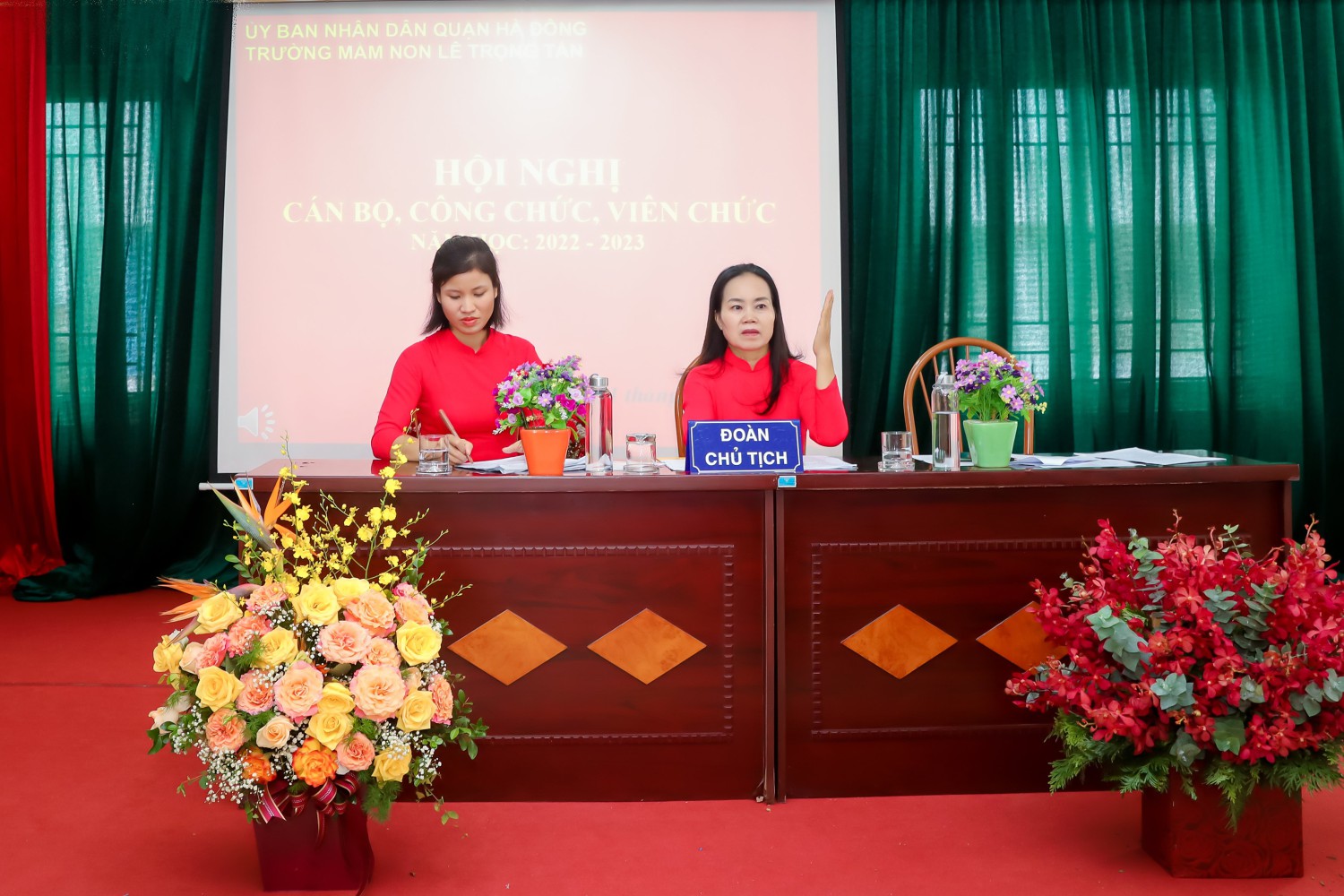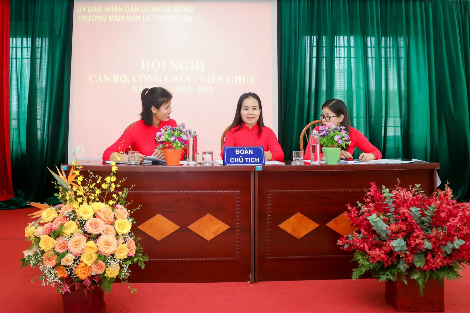 Ban tổ chức giới thiệu thành phần tham dự Hội nghị và nhiệt liệt chào mừng toàn thể các đồng chí CBCC, VC, NLĐ và đoàn viên công đoàn Trường Mầm non Lê Trọng Tấn đã có mặt đông đủ.