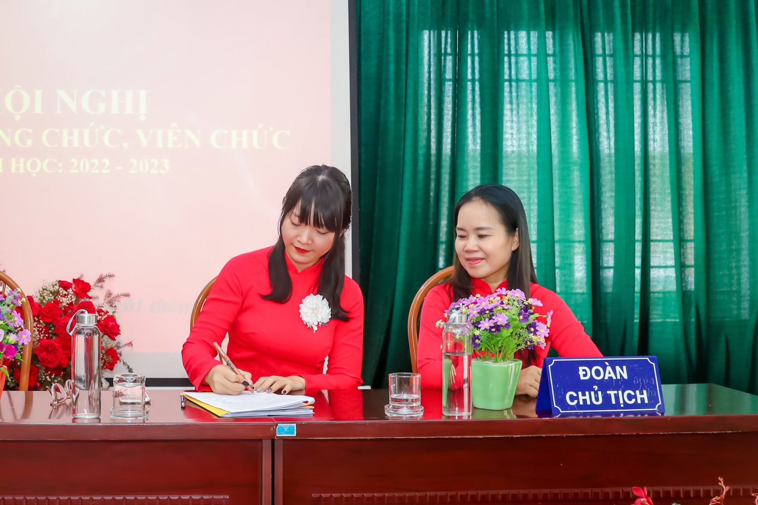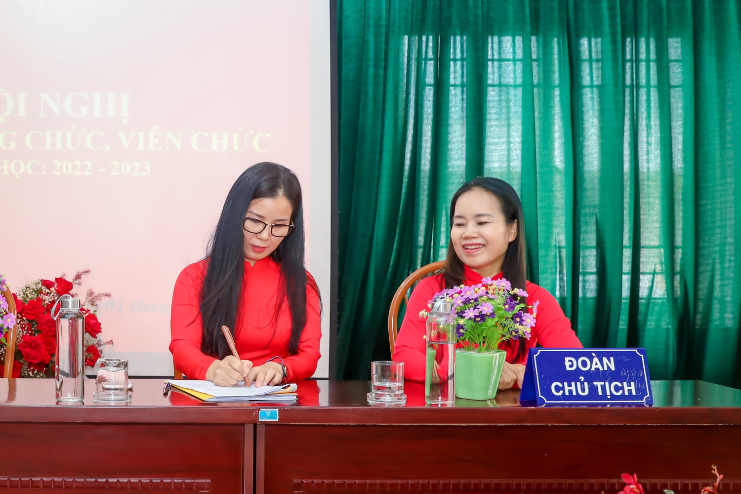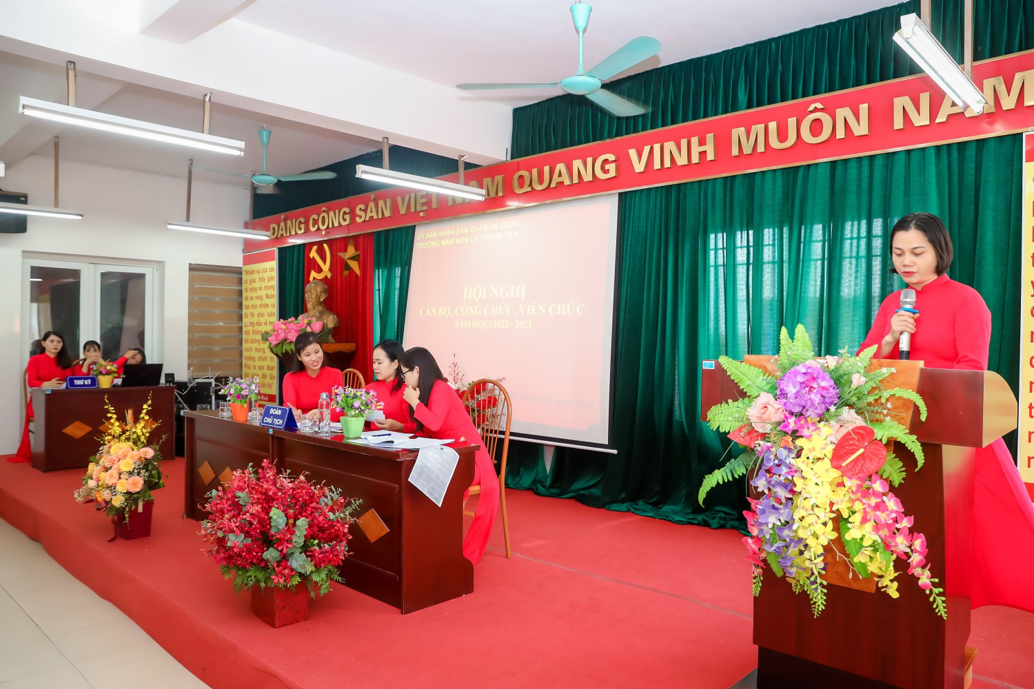 Đ/c Lê Thị Hải - Thư ký hội nghị lên thông qua dự thảo Nghị quyết Hội nghị. 100% đại biểu dự hội nghị đã nhất trí với dự thảo Nghị quyết Hội nghị CBCC, VC, NLĐ trường Mầm non Lê Trọng Tấn năm học 2022 - 2023.