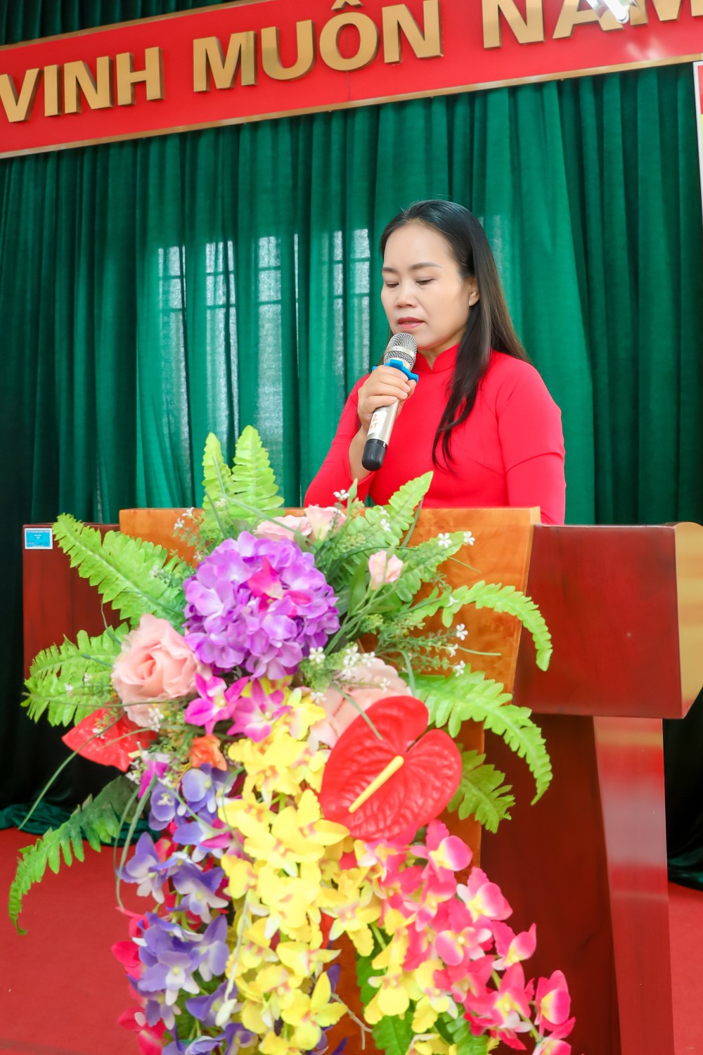 Sau một buổi sáng làm việc với tinh thần khẩn trương, trách nhiệm, Đồng chí Trần Thị Hoa - Hiệu trưởng thay mặt Đoàn Chủ tịch hội nghị lên phát biểu tổng kết bế mạc hội nghị.