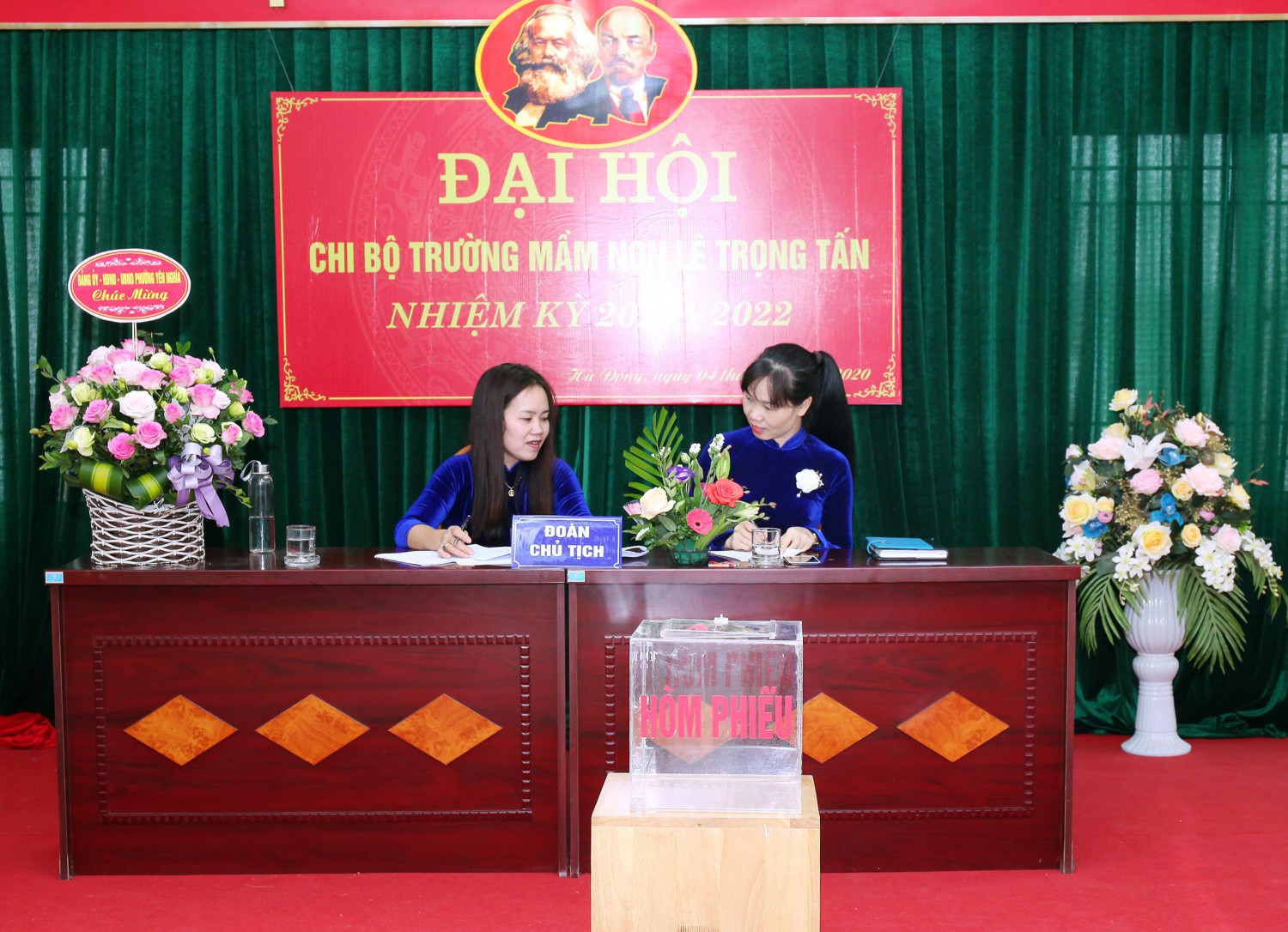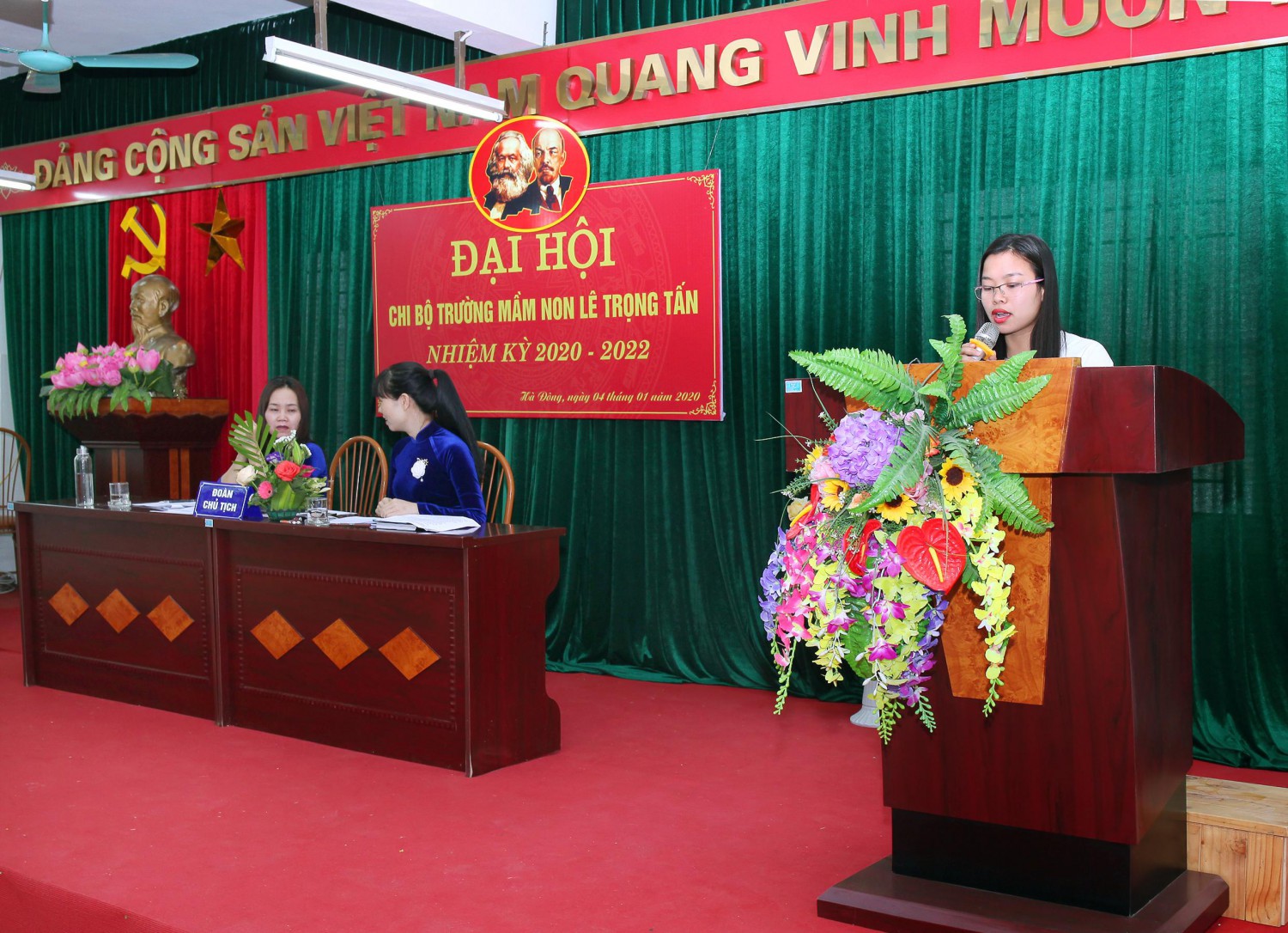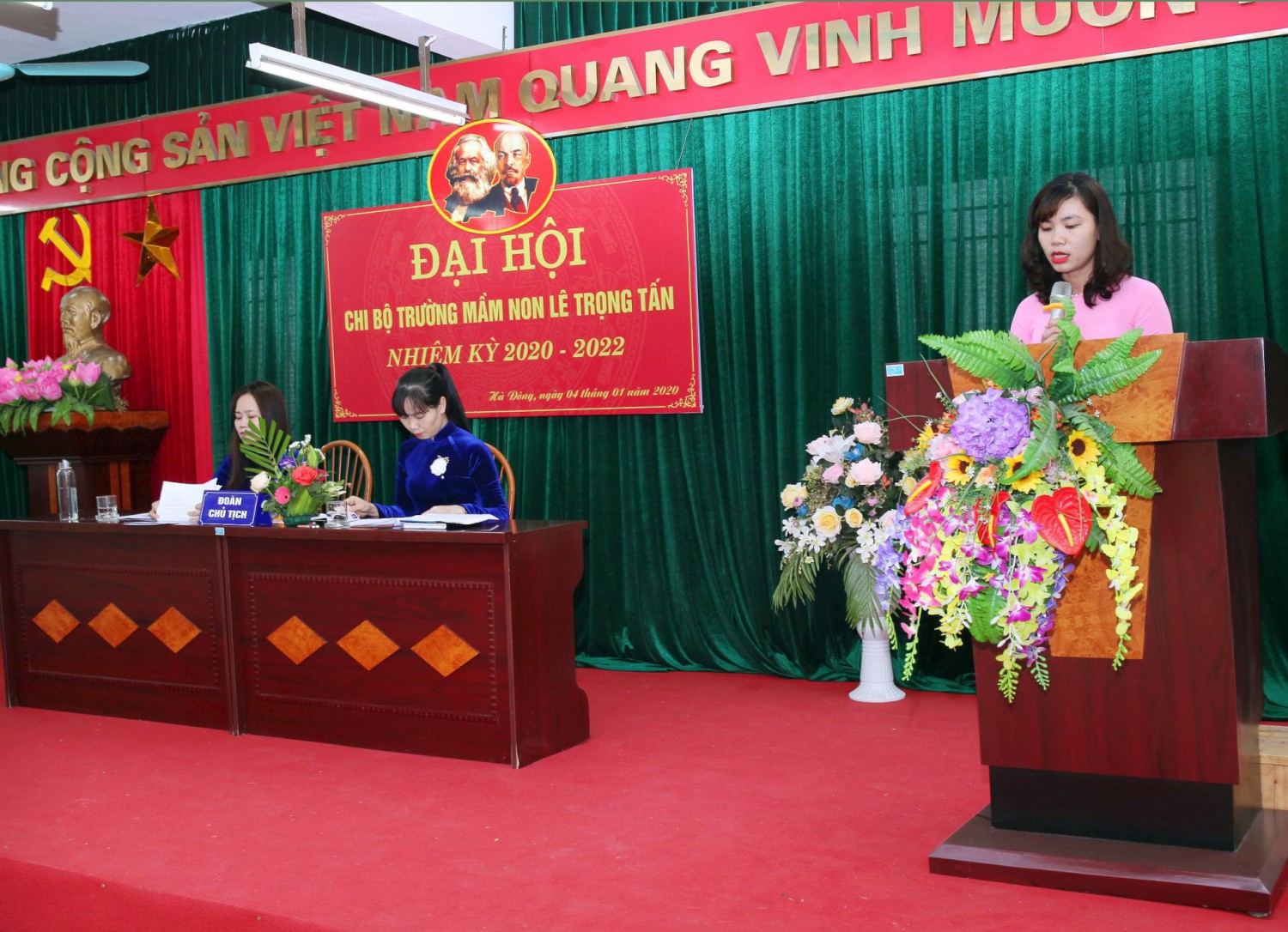 Đại hội đã được nghe báo cáo đánh giá tình hình kết quả thực hiện nghị quyết đại hội nhiệm kỳ 2017 – 2020; Phương hướng, mục tiêu, nhiệm vụ và giải pháp của chi bộ trong nhiệm kỳ 2020 – 2022. Nhiệm kỳ 2017 - 2020, Chi bộ trường mầm non Lê Trọng Tấn đã lãnh đạo nhà trường, các đoàn thể phát huy sức mạnh đoàn kết, bản lĩnh chính trị, tạo sự đồng thuận, thống nhất trong nhận thức và hành động của toàn thể cán bộ đảng viên, giáo viên vì mục tiêu thực hiện tốt các nhiệm vụ phát triển giáo dục. Chi bộ nhà trường đã thực hiện tốt nhiệm vụ lãnh đạo toàn diện, từng bước củng cố và hoàn thiện các điều kiện phục vụ cho sự nghiệp giáo dục, góp phần thắng lợi vào nghị quyết của Đảng bộ phường Yên Nghĩa. Trong suốt nhiệm kỳ, Chi bộ luôn giữ vững danh hiệu “Chi bộ trong sạch vững mạnh”; Chi bộ hiện nay có 12 đảng viên, 100% đảng viên đủ tư cách hoàn thành tốt nhiệm vụ trở lên. Hàng năm, Chi bộ đều bình xét và đề xuất 2-3 đồng chí đảng viên hoàn thành xuất sắc nhiệm vụ được Đảng ủy tặng giấy khen.