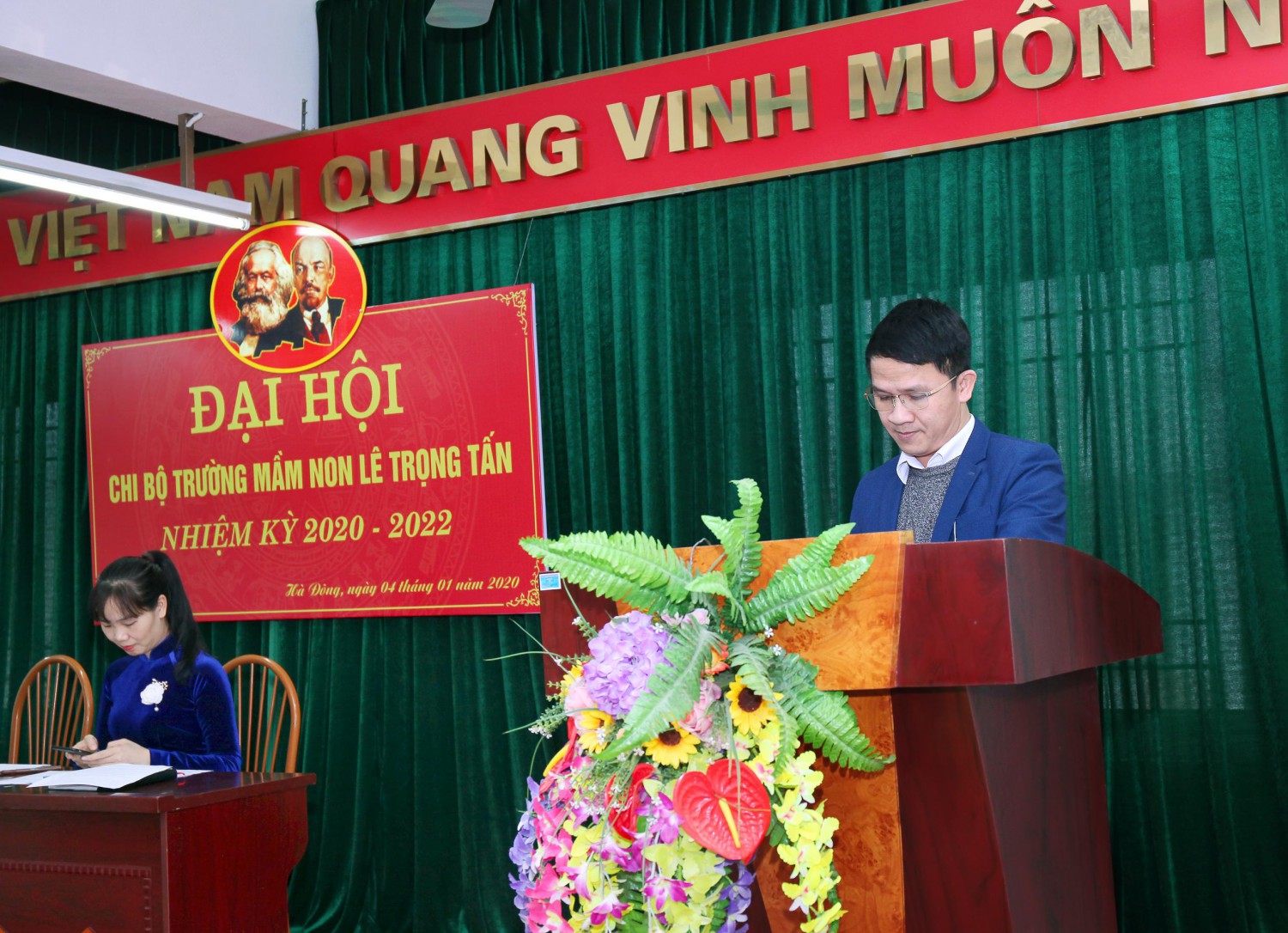Phát biểu tại Đại hội, Đồng chí Nguyễn Vân Chính – Quận ủy viên – Phó Bí thư Đảng ủy phường Yên Nghĩa đã chúc mừng những kết quả mà Chi bộ trường mầm non Lê Trọng Tấn đạt được trong nhiệm kỳ qua. Đồng thời, đồng chí nhấn mạnh những nhiệm vụ trọng tâm trong dự thảo nghị quyết của Đại hội trong nhiệm kì 2020 - 2022. Đồng chí đề nghị tập thể Chi bộ trường mầm non Lê Trọng Tấn tiếp tục nêu cao tinh thần đoàn kết ra sức thi đua dạy tốt, học tốt.