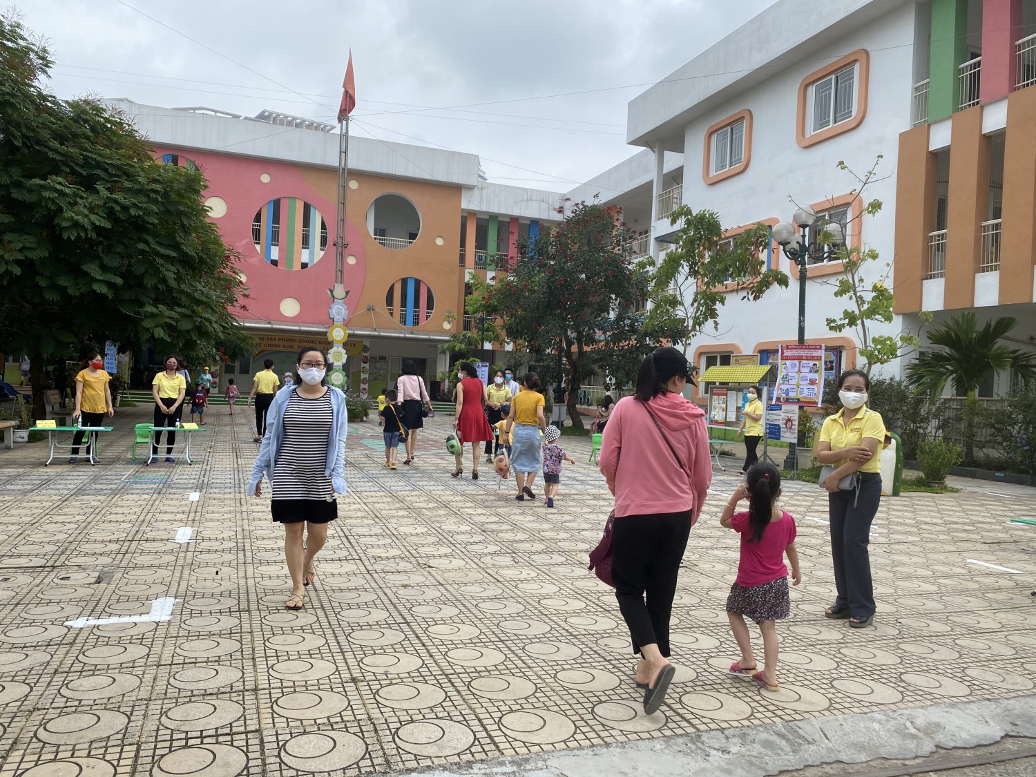 Nhà trường đã tổ chức đón trẻ 5 tuổi tại cổng trường để tránh tập trung nhiều người trong trường. Ở khu vực đón trẻ của các lớp có giáo viên chủ nhiệm đứng đo thân nhiệt, sát khuẩn tay nhanh và đưa trẻ vào lớp học. Đa số các bé đến trường trong tâm trạng vui vẻ, háo hức. Chỉ còn một số ít các em bé lớp 2-3 tuổi còn quấy khóc, làm nũng do thời gian nghỉ dài quá.