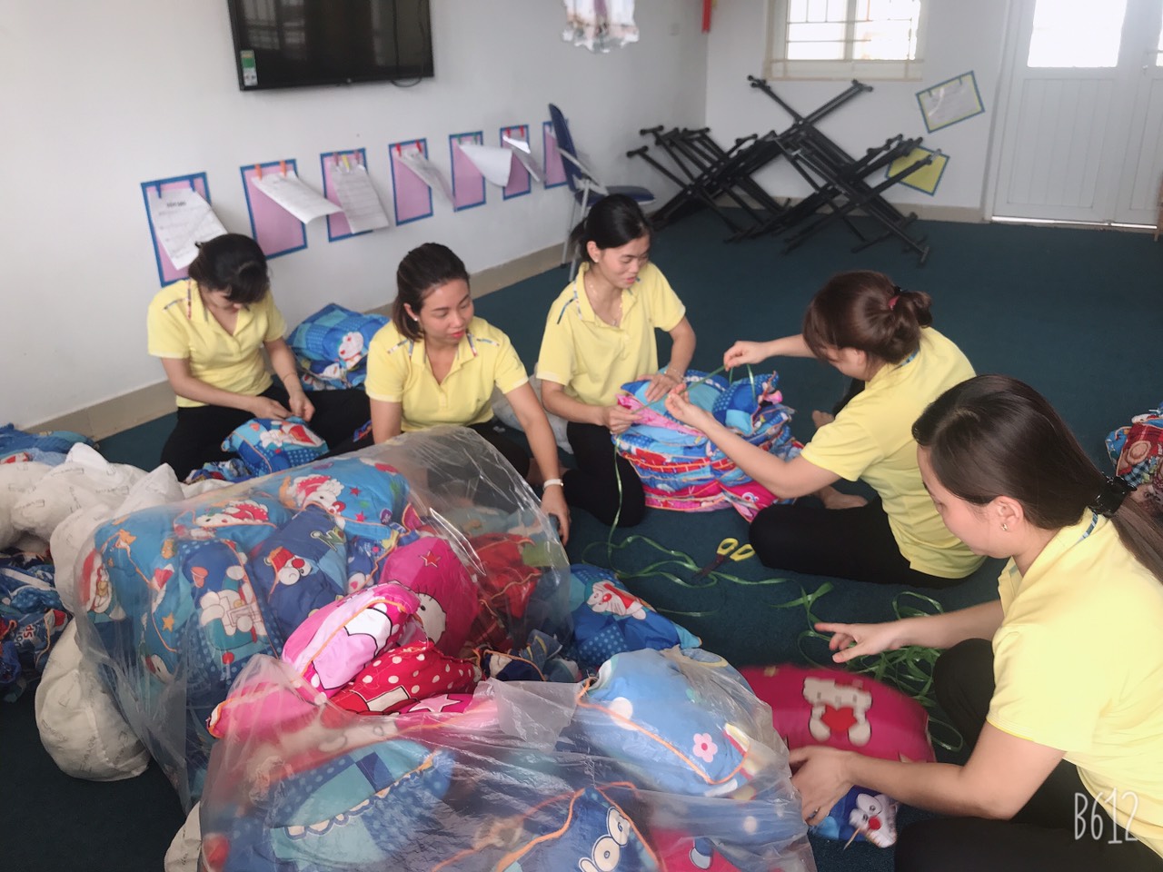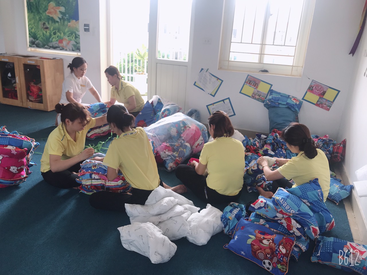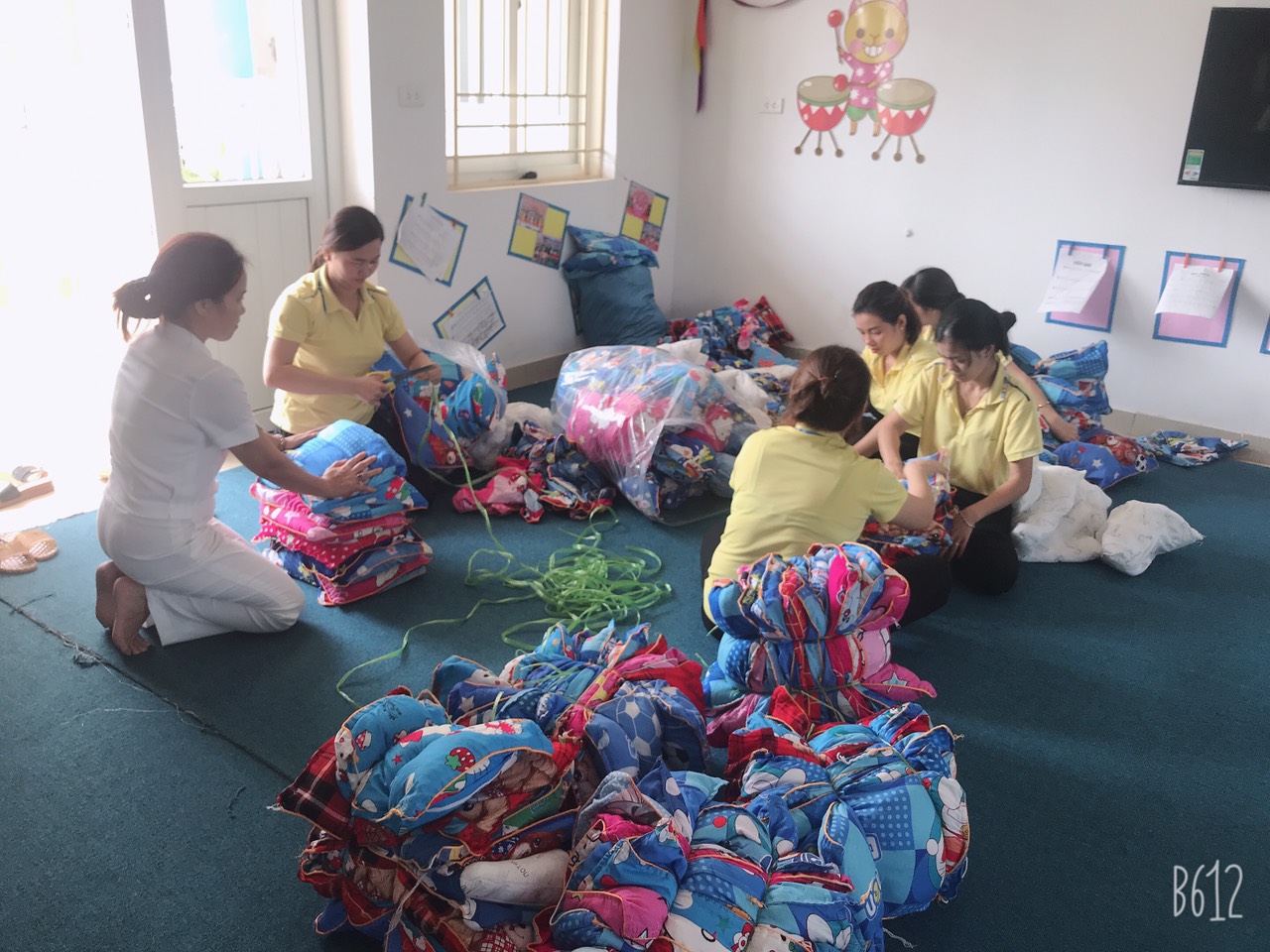 Một vài hình ảnh của các cô giáo đang hoàn thiện đóng túi những chiếc gối để gửi đi tặng.