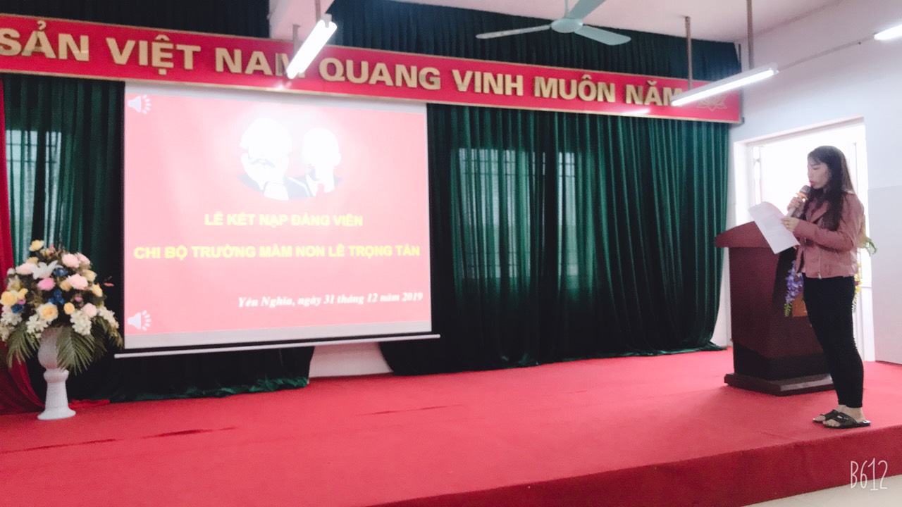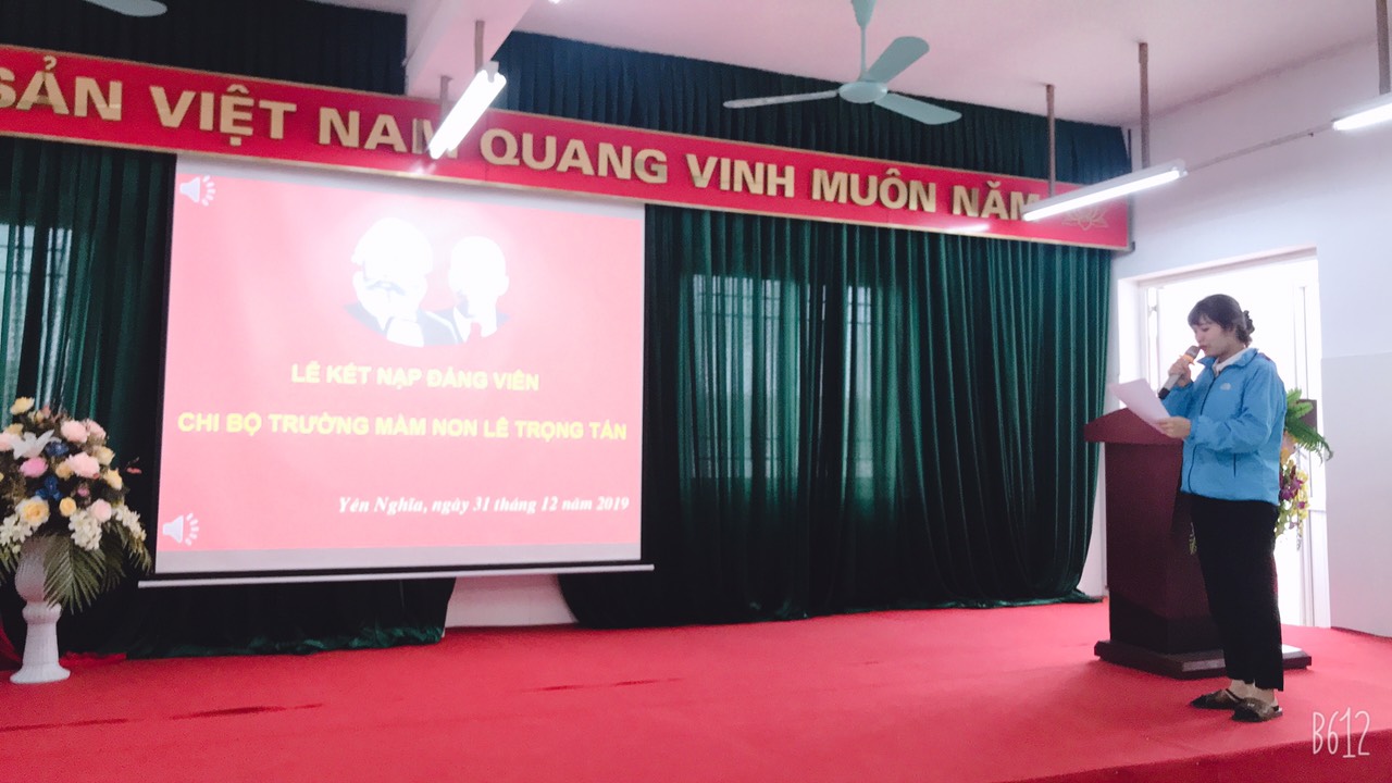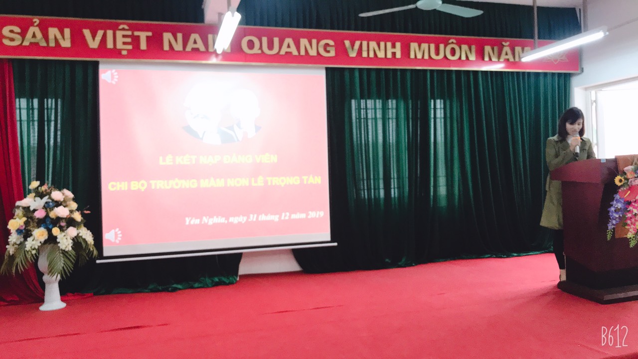 Bồi dưỡng, kết nạp đảng viên mới là nhiệm vụ thường xuyên, có ý nghĩa quan trọng trong công tác xây dựng Đảng, góp phần phát triển, nâng cao chất lượng và sức chiến đấu của tổ chức cơ sở Đảng nói chung và các cá nhân đảng viên nói riêng. Với ý nghĩa đó, được sự giúp đỡ của Chi bộ trường mầm non Lê Trọng Tấn và sự nỗ lực, phấn đấu của bản thân, các đồng chí: Đỗ Thị Hà, Lê Thị Hải đã được kết nạp vào Đảng Cộng sản Việt Nam chiều ngày 31/12/2019 vừa qua.