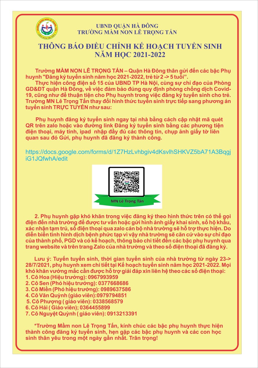 Trường Mn Lê Trọng Tấn kính mong các bậc phụ huynh thực hiện tốt theo thông báo trên và đăng ký tuyển sinh thành công, an toàn. Trân trọng cảm ơn.
