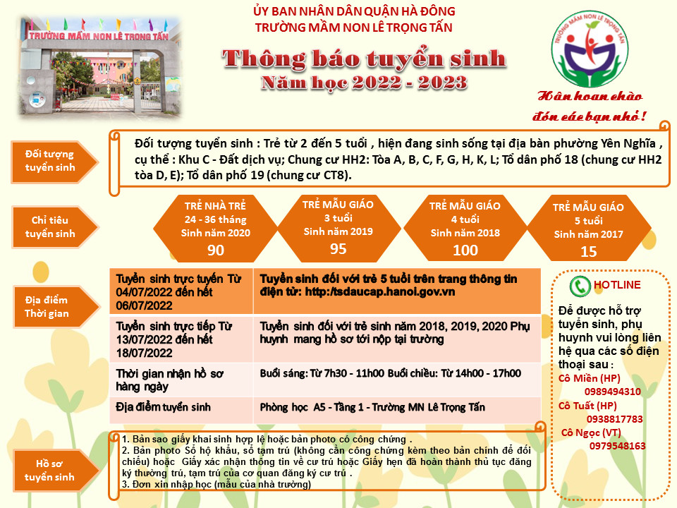Trường MN Lê Trọng Tấn (trường công lập trực thuộc Phòng GD&ĐT quận Hà Đông) thông báo tuyển sinh năm học 2022 - 2023 như sau: